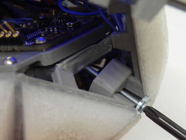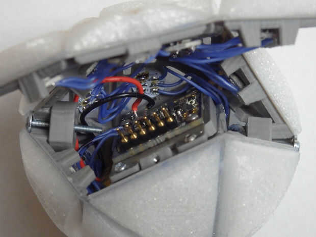 Ahora se puede ver el IcosaLEDron tomando forma, todo lo que queda es las cofias con las esquinas juntos desde dentro. Preparar las tapas primero apretando una tuerca en el hexagonal en forma de sangría en ambos, poner una arandela en un tornillo de 16 mm y el hilo por el interior de cada tapa un poco. Doble ajustadamente en una bola y te darás cuenta las cuatro clavijas internas en ambos extremos se dan cita. Usted también notará una tapa frontal que resulta acceder a las tapas de tablero y al final. Unir la forma y deslice el extremo la combinación de tapa y tornillo en su lugar, ajuste sobre las clavijas internas. Apriete el tornillo firmemente sujetan las esquinas, pero tenga cuidado para no perforar la batería. La lavadora debe ir más allá de la capa externa flexible y descansar en las esquinas de plástico rígido, manteniendo la cabeza del tornillo se pegue hacia fuera más allá de la cáscara. Repita para el otro lado. La tapa frontal ahora puede ser cerrada y asegurada con un tornillo de 6 mm desde el exterior.