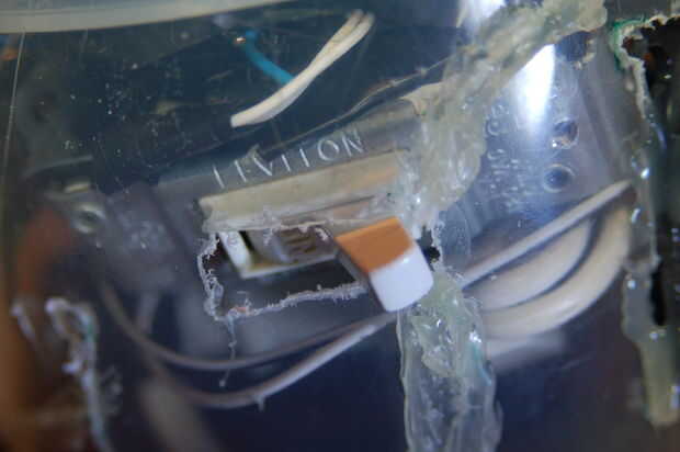 Poner el cable de extensión en y enchufe el transformador de energía. Empujar el interruptor a través del orificio es para en la parte posteriora y hotglue el interruptor en su lugar.