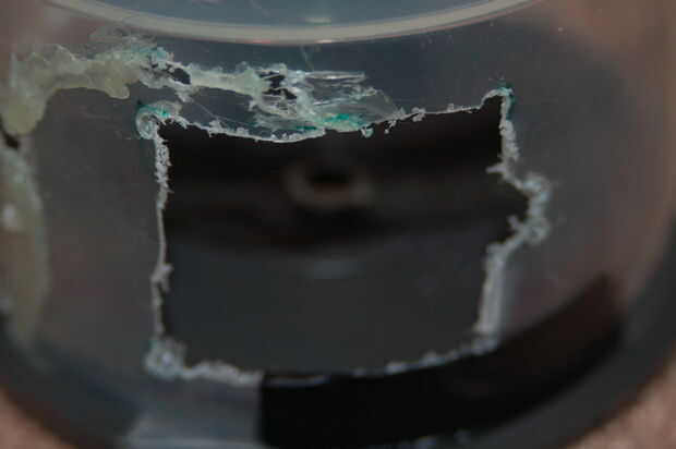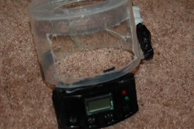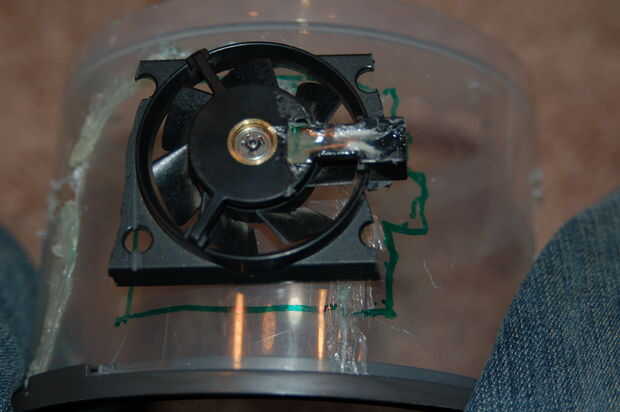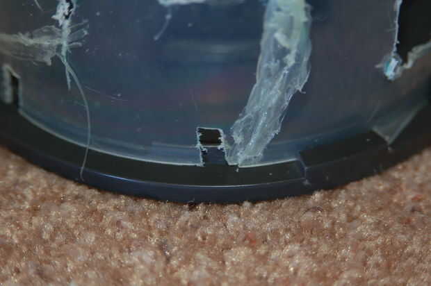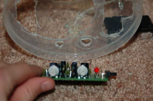 Primero debe mantener el objeto detrás del plástico y contorno con un rotulador. El adaptador de acoplamiento irá en la parte superior y la espalda, el orador delante de él, y controla el volumen de los amplificadores al lado. el reloj va en el frente, una ranura para lightswitch en la espalda y un agujero para el ventilador. Utilice el cuchillo y la pequeña sierra para cortar los agujeros. Use el 1/4 de pulgada a archivo una ranura para el cable de extensión. El caso en el fotos parece bastante golpeado porque tenía que probar varias veces para sacar este proyecto a trabajar. También debe serrar la clavija central de la pila CD base como cerca del fondo como usted puede conseguir.
