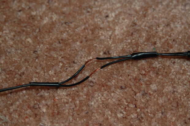 En este paso aprenderás cómo hacer el cable de alimentación. Tomar el transformador que trabaja con su amplificador y separar los dos cables en tres lugares y cinta adhesiva los extremos del área que está separada por lo que todo esto no split apart. Tira de los dos cables por pellizcar los extremos de lo que se quitó con el pelacable y usar el cuchillo de la pluma para cortar horizontalmente entre las dos áreas pellizcadas para bajar el aislamiento sin cortar el cable (que era difícil de explicar pero hice lo mejor que pude). Esto se debe ver como la primera foto. Necesita tener tres juegos de estos desmontes. Pedacitos de cable eléctrico de la soldadura sobre 3 pulgadas largo cada cable en los tres sistemas de desmontes y cubra el alambre sin aislar con cinta aislante para evitar cortocircuitos. El cable de alimentación final debería verse como la segunda foto.