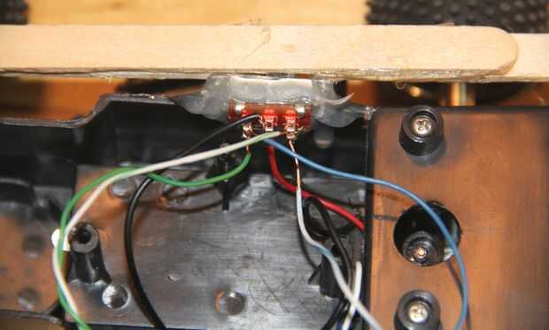 Probar las conexiones y asegúrese de que todo funciona antes de empezar a pegar caliente. Las ruedas deben girar hacia adelante o hacia atrás cuando usted enciende el interruptor de encendido a. Entonces al cambiar el interruptor DPDT debe ir la dirección opuesta. Si este es el caso entonces empezar a caliente pegue el interruptor en un buen lugar en el chasis. Si no funciona, asegúrese de que todo está conectado correctamente y también que ninguno de los alambres se toquen. Tenga cuidado de cortocircuitos. Si las baterías se calienta en cualquier momento llevarlos a cabo y comprobar el cableado.