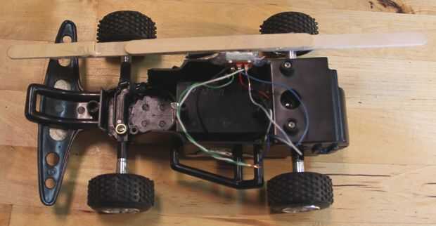 Este coche puede crearse desde cualquier viejo coche RC que tiene un motor. Este coche está diseñado para ir hacia adelante o hacia atrás cuando topa con un objeto. También se puede convertir en un juego con dos personas que puede ser muy divertido!