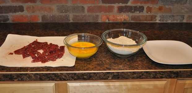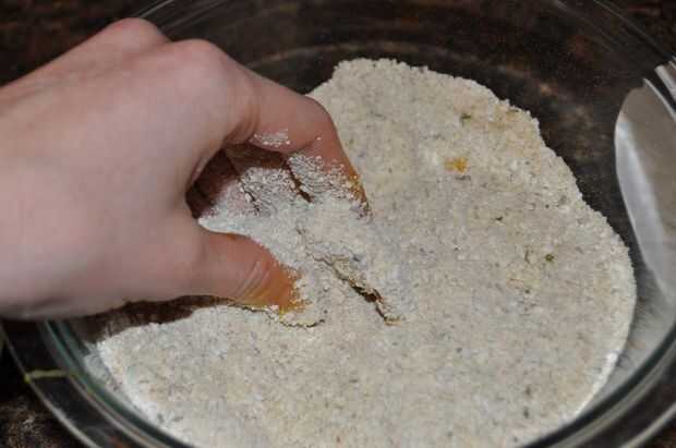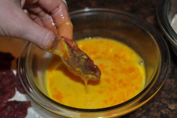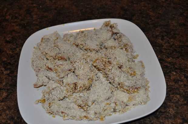 Luego mueva el strip steak curmb cubierta de mezcla de pan y presionar firmemente empanado en seak.