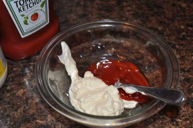 Mezclar partes iguales salsa de tomate y mayonesa en un bol y listo!