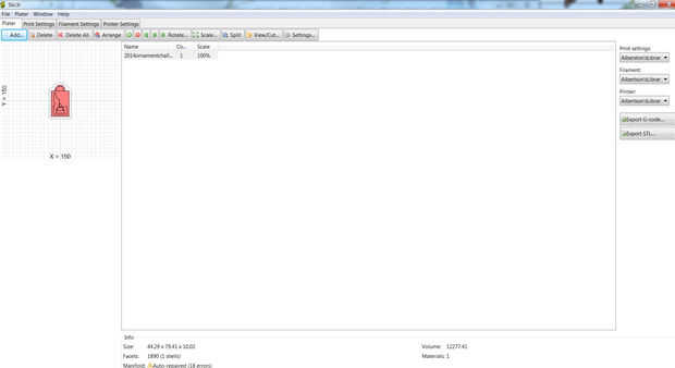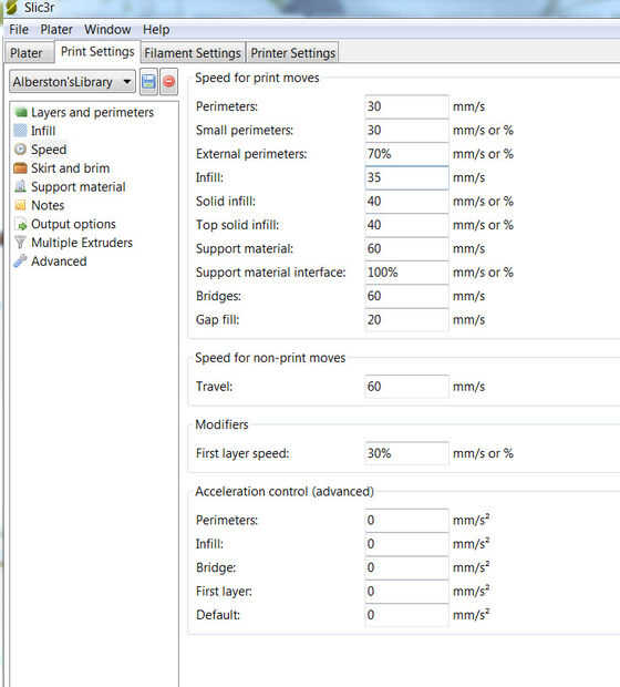 Una vez que el archivo fue múltiple, teníamos que cortarlo. Usar Slic3r para hacer esto y generar el código G. Aquí están algunas de las configuraciones que utilizamos para imprimir: