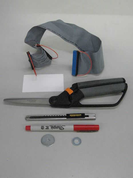 Para iniciar este viaje, usted necesitará uno o más cables IDE (los cables de 80 conductores son mejores, ya que utilizan cables más finos, más flexibles), una navaja filosa, un par de tijeras (tal vez no su mejor, estarás pequeños alambres de corte con ellos, ya que probablemente te vienen lejos este proceso menos agudo que entraron), una tarjeta de visita , un rotulador, un par de arandelas de diferentes tamaños y una regla (no mostrado aquí).