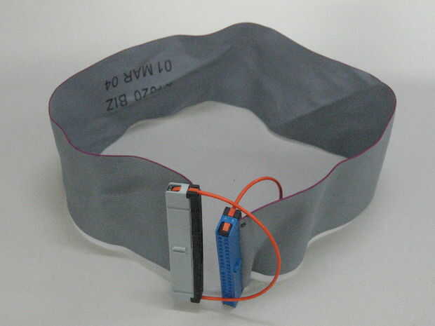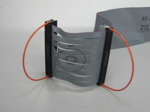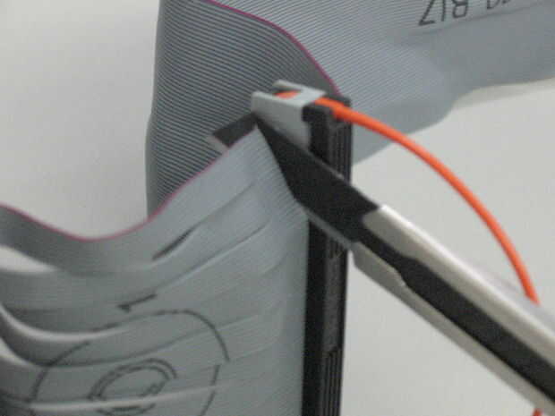 Muchos cables IDE tienen un conector para la placa madre, una buena longitud de cable, dos conectores juntos, así que pueden conectar unidades en bahías adyacentes sin mucha holgura. Es demasiado corto para usar como un marcador, así que usar el cuchillo para cortar que la longitud del cable entre los conectadores de la impulsión de dos. Puede guíese por el borde del conector y el cable cortado al ras con el conector que está manteniendo.