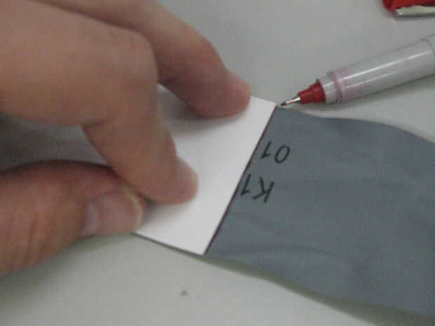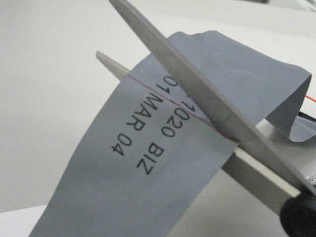 Usando la regla (ahora en la foto!), marque con una pequeña señal en el cable en la longitud que se desea que el marcador sea. Puede cortar el cable en dos mitades iguales, o medir la altura de su libro favorito y restar una o dos pulgadas. Esta parte depende de usted. Decidí cortar uno corto uno (6" o algo así) para libros en rústica y una más para mi guía de estudio CCNA. Después de que ha hecho su marca o marcas, poner la tarjeta en el cable, borde largo a lo largo de la longitud del cable y dibujar una línea en el cable por el borde corto de la tarjeta, para que tenga una línea de corte esté a escuadra con el cable. Por último, utilice las tijeras para cortar bueno y recto a lo largo de esta línea.