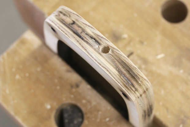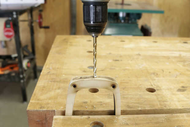 Tapa del soporte de madera en el borde y perfore un orificio de 1/4" en el centro de su cara flaca (es decir, la parte inferior de la bombilla).