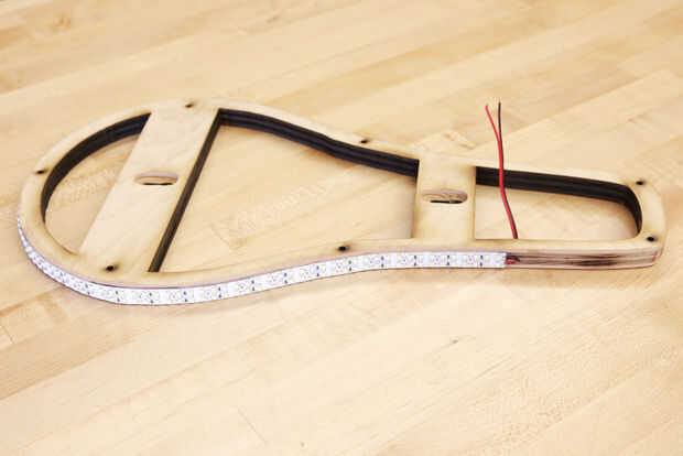 Inmediatamente después de que haya secado el cemento de contacto en el marco y la tira del LED, con cuidado y firmemente pegan los dos.
