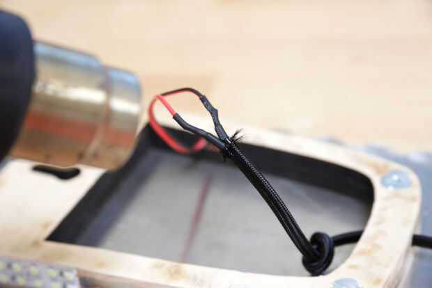 El cable de tela de alambre a la tira de LED y aislar la conexión con el tubo del encogimiento.