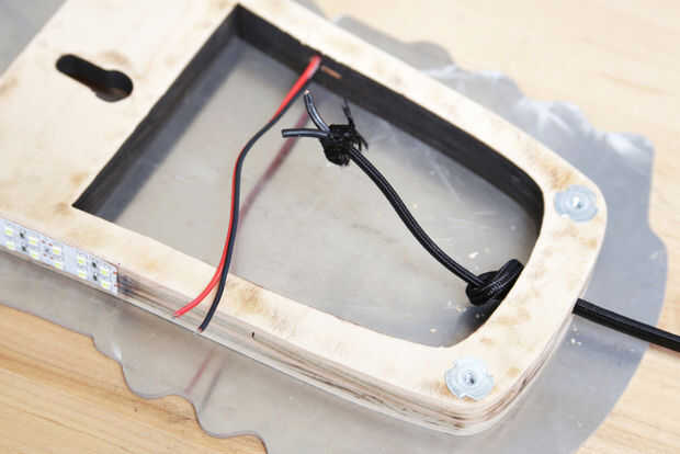 Pase el cable de la tira del LED a través del orificio 3/16" en el lado del marco.