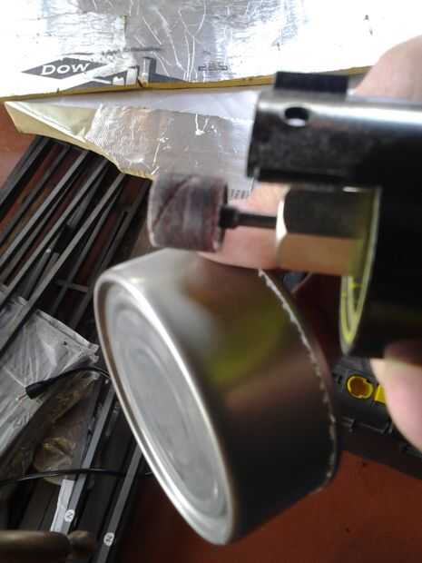 Si se utiliza un soldador del punto, necesita utilizar su herramienta rotatoria con una pequeña banda de lijar poco para pulir el esmalte o pintura de un pequeño ¼" tamaño área en ambos lados en el centro de las marcas de la Cruz. Esto permitirá que al soldador del punto actual fluya con éxito soldar los puntos de contactados. Mediante la práctica de unirse a las latas que obtendrá mejor alineando cosas. La acción de la palanca de los consejos de la soldadora por puntos ayuda a comprimir y mantener las latas juntas para la soldadura. A veces si la continuidad no existe, puede oscilar las latas hacia adelante y hacia atrás manteniendo el gatillo de soldadores y la fricción cortas los puntos de contacto en la conducción. El soldador típicamente buzz muy bien cuando las cosas son buenas y la soldadura iluminará un poco naranja por un segundo. Eso es todo lo que necesitas.
