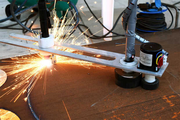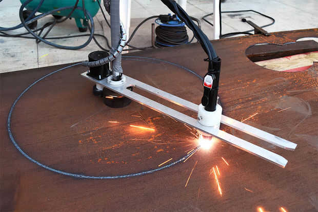 Había diseñado y había hecho una herramienta, donde se podría colocar y giraba el cortador del plasma. De esta manera, nuestro transportador eléctrico gira y apoyado por los cortes de corte de plasma el material en círculos, anillos en el tamaño que hayamos elegido.