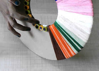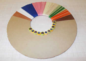 Tiempo de agregar las bobinas firmemente en el arte. Tomar las bobinas firmemente y aplicar pegamento a ellos. Pegar en el espacio central, en el borde del círculo interior, que no se cubre con lana.