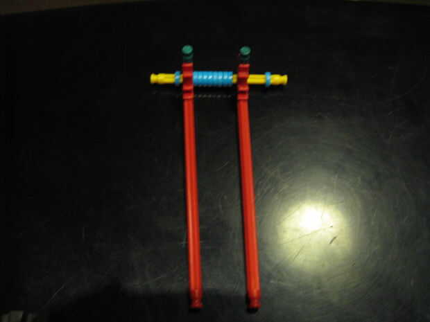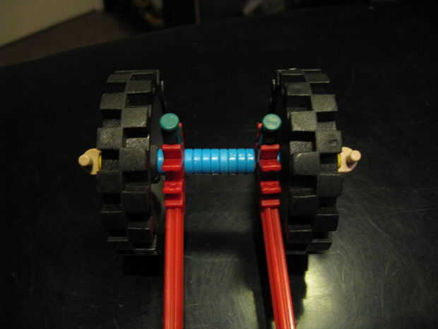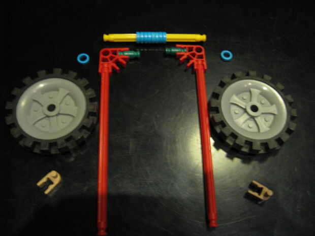 This is easy. Incluso no tienes que construirlo. Crear tu propia si quieres. Esto es sólo el básico de basic. 1. obtener las piezas 2. Ponga el rojo conectores como tal y añadir un espaciador azul a ambos lados 3. Añada las ruedas y un clip tan para asegurar en