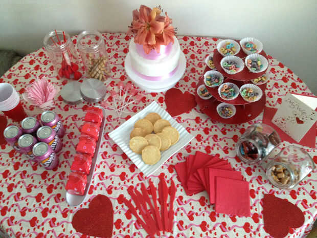 Cubrir la tabla con la hoja de la tabla del día de San Valentín/corazones de Dollarstore