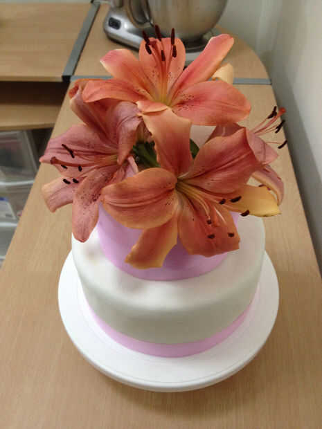 Para la torta, puede hornear cualquier pasteles de su preferencia (sé de San Valentín es el único auténtico pastel de terciopelo rojo, pero la torta era llanura de chocolate y vainilla). Porque era muy perezoso, sólo cubre el pastel con fondant normal y cortar tiras de hoja de azúcar rosa y adjuntarlos como superposición de la cinta entonces sólo colocar flores frescas en la parte superior. De la persona perezosa seriamente torta ;-)