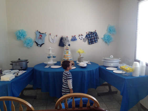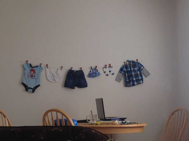 Una línea de paño también hace gran pared decoración. Y puesto que esto era para baby shower de niño, toda la ropa obviamente para chicos :) Colgué a través de un cable con clavijas de tela metálica (no pernos del paño, son exactamente para electricidad) y luego con la ayuda de clavijas de la pared, enredado el hilo en ellos.