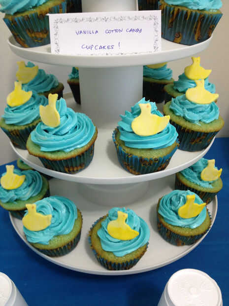 Cupcakes con patos amarillos de crema de chocolate y azul, vainilla de algodón de azúcar con sabor a