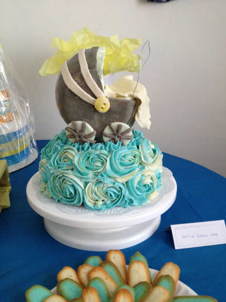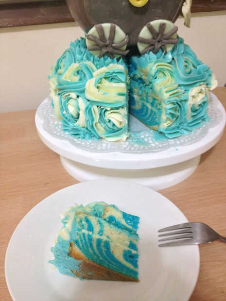 Precalentar el horno a 180 C. grasa tus sartenes (2 7 pulgadas o 1 9 pulgadas), línea con pergamino y grasa otra vez. Bata las claras de huevo y emulsor hasta que esponje. Agregar azúcar poco a poco y seguir batiendo hasta que espesó y firme. Incorpore la mezcla de harina con el almidón de maíz. Agregue la margarina derretida. Dividir en dos cuencos, uno como es, uno coloreado con colorante azul. Vierta la masa alternando entre sí en el centro de las cacerolas. Hornea durante 30-45 minutos hasta que insertar un cuchillo en el centro salga limpio. Cubrir y decorar con crema de mantequilla y dar un adecuado adorno de su elección (cigüeña, bebé, bebé carro etc.)