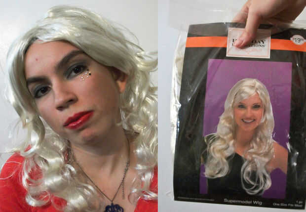 Ahora viene la parte más importante: ir rubia! Si ya tiene el pelo rubio, está bueno para ir! Pero, para aquellos negro, marrón o pelirrojas que hay, puede recoger una peluca rubia y ponga encendido, como lo hice! Esta peluca fue comprada en una venta de Halloween después en de Joann!