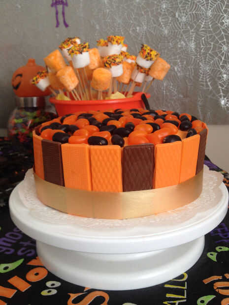 Chocolate pastel de naranja - puede usar su pastel de chocolate favorito obviamente pero la crema que uso es SMBC, teñido en naranja saborizante y colorante. Decoré la tapa con gomitas y el lado con chocolates moldeados, usando chocolate oblea de color naranja y regular.