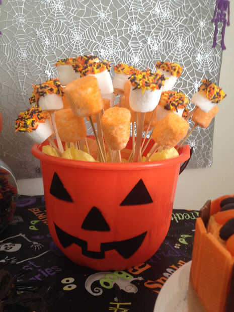 Cubo de malvavisco - todo lo que necesitas es capa de oblea de chocolate, malvaviscos grandes, azúcar Granillo naranja color y sprinkles de Halloween de su elección. Fundir el chocolate, palillos del lollipop de la inmersión e inserte en malvavisco luego sumergir los bombones en chocolate y espolvorear con azúcar o sprinkles de Halloween. Dentro de la cubeta (disponible en Warlmart o almacén del dólar, coloqué una flor espuma/espuma de poliestireno para sujetar los palos.
