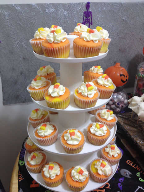 Y dulces pastelitos de maíz - se puede utilizar cualquier torta de vainilla/blanco de su elección que la masa se divide en porciones, teñir con colorante de gel naranja y amarillo y la pipa en moldes de muffin uno encabezando otro como color maíz de caramelo. La crema siempre SMBC y usted puede condimentar como usted prefiera. Superior decorar cada cupcake con maíz de caramelo
