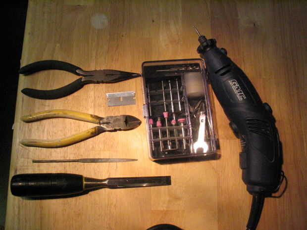 Las herramientas que necesita son: herramienta rotativa favorita - mina es un GMC, pero cualquier cosa que se puede girar a velocidades variables y usar un esmeril, el tambor de lijar y pedacitos de taladro pequeño funcionará. El siguiente es una hoja de afeitar, ayuda a eliminar exceso piezas de plástico de pulido/lijado también a lo largo de las líneas de la eliminación de plástico extra es realmente un pequeño archivo, realmente no es necesario, pero ayuda a limpiar los bordes ásperos. Alicates de punta y cortadores de alambre son muy útiles, pero no necesariamente necesario.