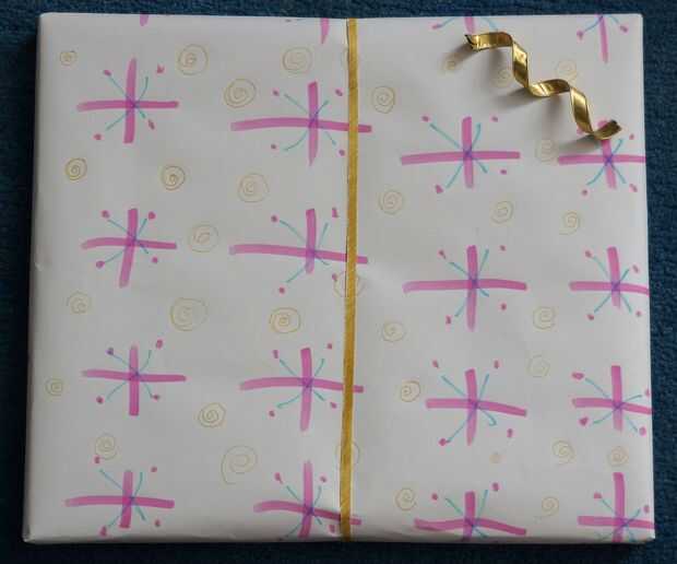 Tomé una hoja de papel del manojo, miré mis regalos y decidió que envolver. En este caso tenía un marco de fotos bonito, un poco más grande que mi hoja de papel, así que tomó dos hojas y decoradas de la misma manera, les pegan y envuelto el marco. Noté que los pequeños agujeros donde las grapas mantienen las hojas en su lugar debían ser vistas, por lo que de color una franja de papel fino imitando un cordón dorado y pegan en lugar. Como vi que mi regalo era un poco triste, que me acordé de que todavía habían algunos selladores de bolsa de té largo así que, envuelto alrededor de un marcador y un lindo espiral que grabado hasta la actualidad.