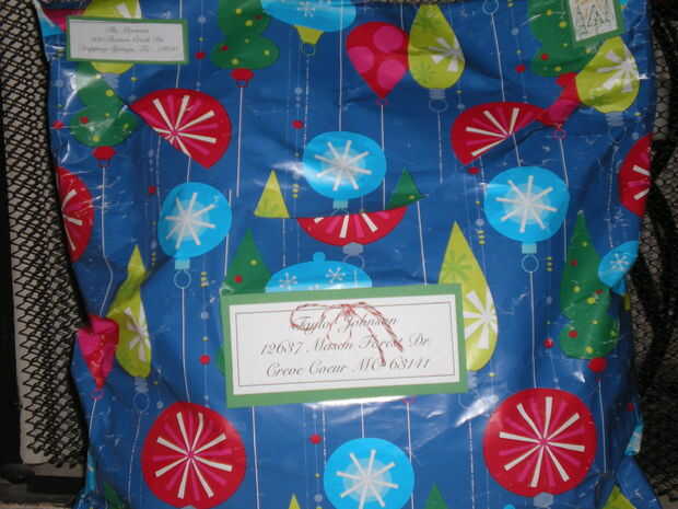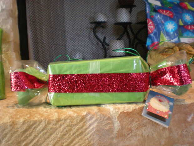 Para mis abuelos, envuelven todos sus regalos como caramelo. Uno era los colores de un bastón de caramelo, uno estaba envuelto como una caja de chocolate, y una envuelta como una menta con los extremos atados. Todos ellos fueron envueltos en papel celofán para darles un efecto más realista.