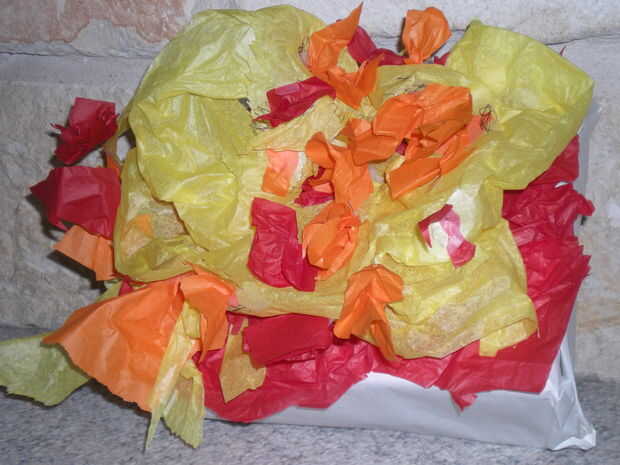 Embalaje: envuelto como un regalo regular con llamas hechas de papel de seda a la parte superior de la misma