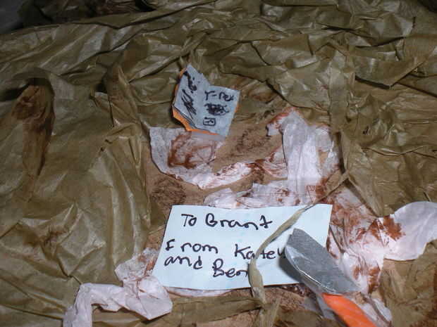 Embalaje: envuelto en papel marrón con marrón papel de tejido, un montón de huesos, un libro guía, y pala, también todos hechos de papel de tejido