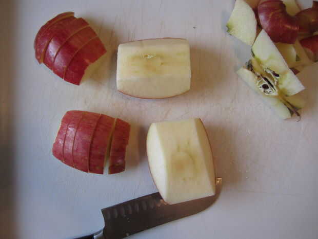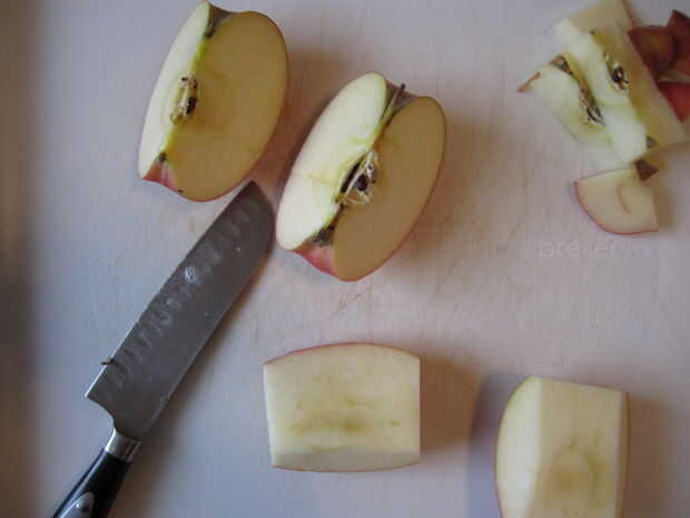 (La mejor manera de hacerlo es cortar la manzana por la mitad, cuartos y corta la base. Entonces usted puede picarla en trozos pequeños sin preocuparse por las semillas o pedacitos de maderosas. ¡ Fácil!)