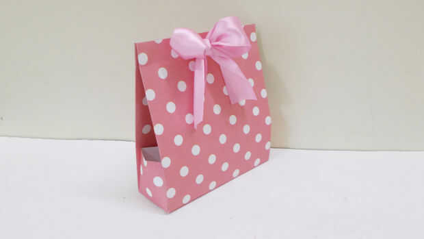 Hacer una cinta de raso rosa y pégalo en la bonita bolsa de papel con una perla decorativa en el centro.