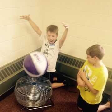 Utilizando un ventilador de fuerza industrial, supervisión de un adulto y unas bolas de playa, los niños pueden pasar un buen rato jugando con principio de Bernoulli. Simplemente encienda ventilador y cuidadosamente coloque la bola en la corriente de aire. La bola permanece flotando sobre el ventilador. Trate suavemente golpeando ligeramente la bola para moverlo. Usted debe encontrar que quiera volver. Trate de dos o tres pelotas de playa. Trate de bolas de playa de diferentes tamaños. Trate de esferas de diversas masas. No use cualquier cosa que pueda entrar el ventilador.