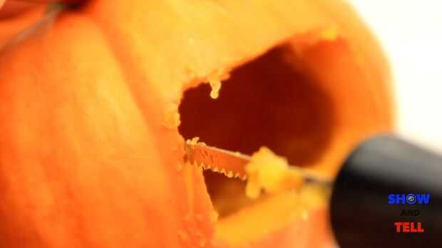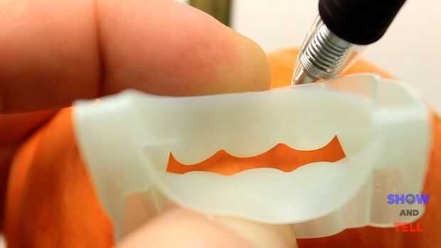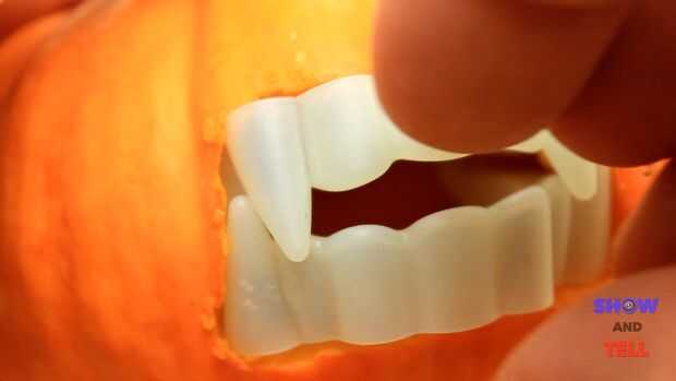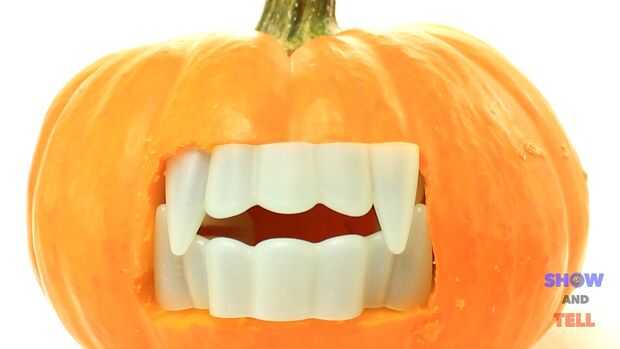 Utilizar algunos colmillos de plástico y la calabaza en un vampiro. He recogido un conjunto de 8 dientes de vampiro brilla en la oscuridad por un dólar. Trazar los dientes sobre la calabaza. Recorta la boca y quitar las semillas. Inserte los dientes. Simple como eso.