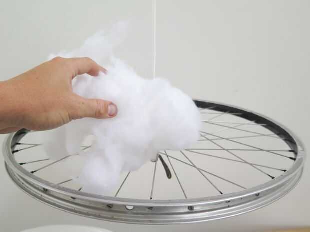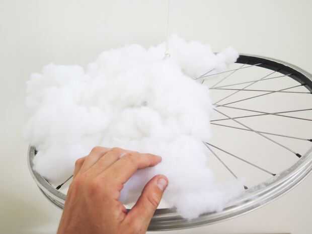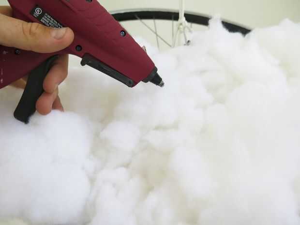 Añadir algunos puff a tu nube pulsando en relleno a través de los radios. Puede caliente pegamento esporádicamente para mantener mantener tufts juntos en todo. Comenzar con soplar por la parte superior de su rueda de la bici donde será más fácil.