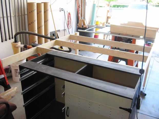 Para soportar las pesadas puertas, construí un marco de madera de pino de 3/4". Este marco fue unido al gabinete por un lado y sostenido por patas ajustable 2 por 4 en el otro.