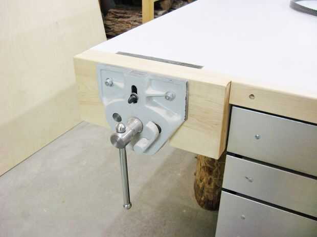 En el lado de la mesa, la cara se atornilla al borde de la tabla sí mismo. En el otro lado, la cara era atornillada a la mordaza con los tornillos pequeños que habían sido ajustaron en el arce debajo de la superficie de la cara de madera.