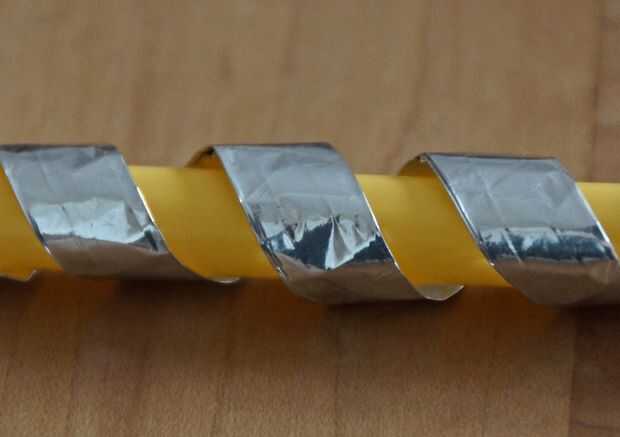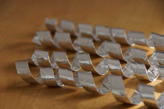 Es siempre como esta, que añadir o cambiar materiales como ir, hasta que creo que ' "armonizar". Esta vez he añadido papel de aluminio para hacer unas espirales. Me corte un pedazo largo, había doblado en una franja amplia de 0,3 pulgadas y envuelto alrededor de una pajita (un lápiz también funciona). El primero de ellos parecía muy agradable, que me decidí a hacer algunas más.