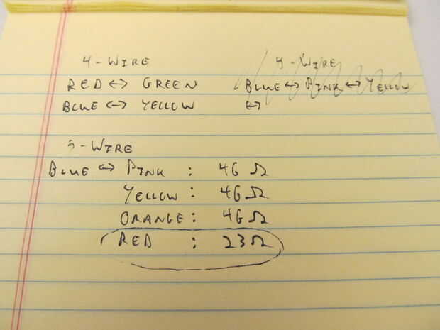 Antes de conectar el motor paso a paso, tenemos que identificar que los cables estén conectados a la bobina misma. Para ello, podemos utilizar un ohmímetro. Para cada conductor, dos de los otros conductores producirá una señal de "sin conexión" del medidor de Ohm, mientras que uno de ellos resultará en una resistencia pequeña.
