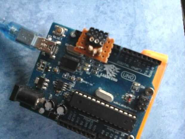 Después de había construido el circuito, puede conectar a la placa Arduino UNO usando la cabecera del hombre. (Pines GND, 13, 12, 11)
