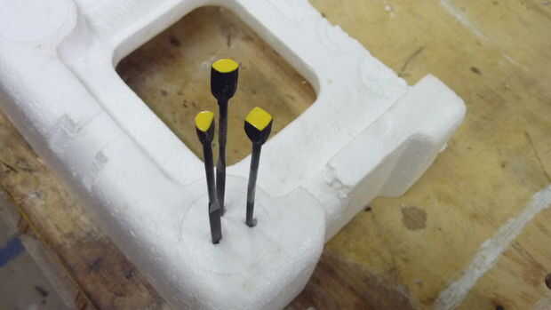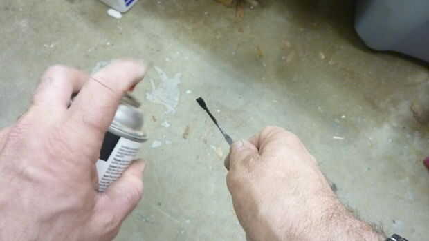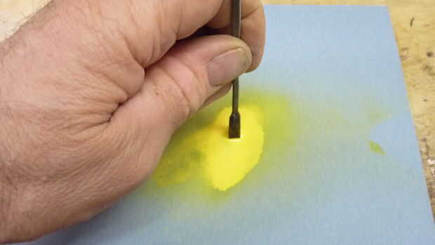 Cuando esté seca la pintura oscura, rocíe su color brillante sobre una hoja de papel y sumergir el extremo de la manija.