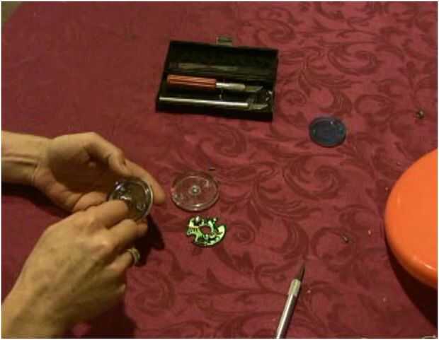 Desmontaje del yoyo es muy fácil. Desatornille las dos mitades, y verá que el eje pasa a través de algunas pequeñas piezas metálicas que sirven de cojinetes que permiten que el yoyo a girar. Retire las piezas del eje (que simplemente deben deslizarse apagado). Ahora, utilice un destornillador pequeño para quitar los dos tornillos de cada mitad del yoyo. Esto permite que cada mitad ser separado en las cubiertas de plástico y placas de circuito impreso que contiene los LEDS y baterías.