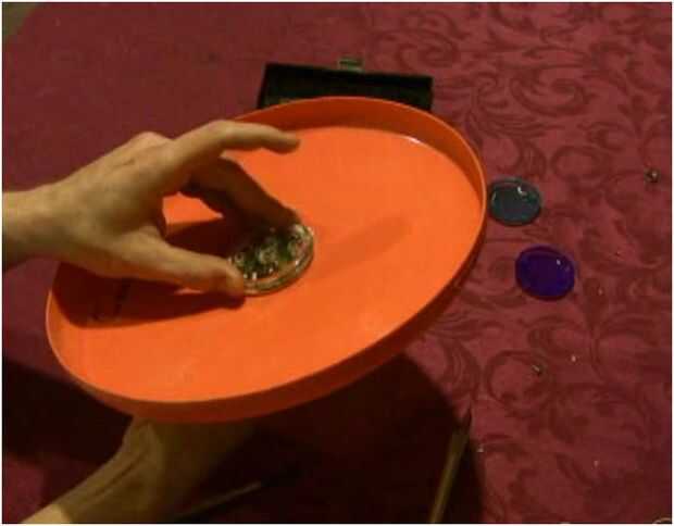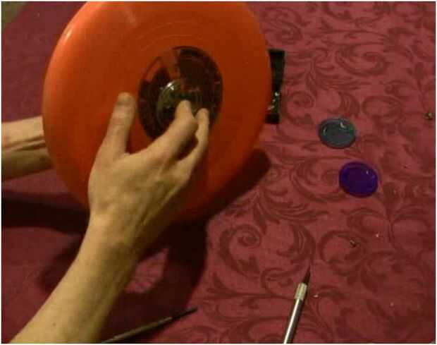Ahora, tomar las tapas de plástico interiores de cada mitad del yoyo, invertir las placas de circuito cara hacia fuera y coloque dentro de las cubiertas de plástico. Colocar una de estas mitades del nuevo sobre el disco volador y el otro en la parte inferior por lo que están centrados con el orificio hecho en el frisbee. Introduzca el eje a través de la parte superior, a través del orificio del disco volador y en la parte inferior media. Apriete el conjunto girando la parte inferior que la mitad y volver a pasar sobre el eje. Eso es todo!