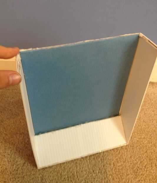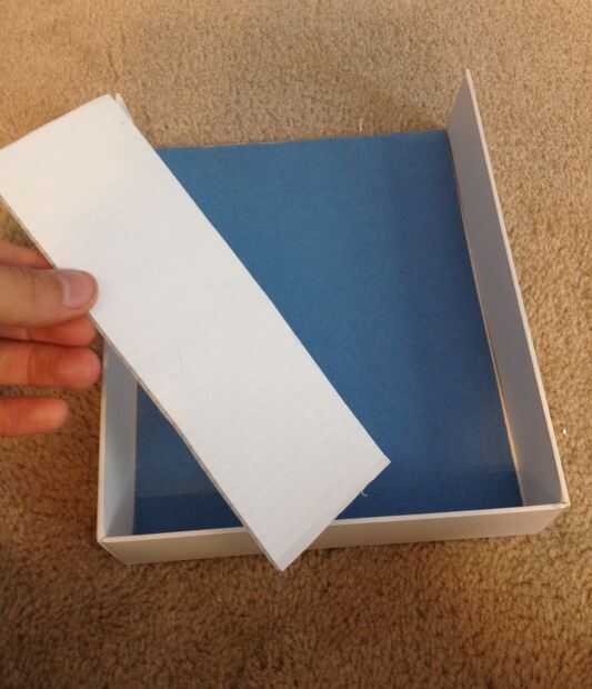 Una vez que han reunido todos los materiales, puede comenzar la construcción física. Antes de comenzara en este proyecto, yo capas del interior de la caja de iPad con papel de construcción - es por eso que la caja es azul. Esto no es necesario para este proyecto. Con la porción más pequeña de la caja (no la tapa), quité la capa superior de la caja. Luego, utilizando el plástico corrugado, corte una tira que encajaría en la caja del iPad en un ángulo. Caliente pegué esta pieza en un ángulo para que los lápices iría al punto más bajo de la caja.