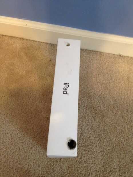 Después de caliente pegué todas las piezas internas inclinadas en la caja de iPad, comencé a taladrar agujeros en la caja para los lápices entrar y salir. En la primera imagen, puede ver un agujero en la parte superior de los lápices entrar y un agujero más grande en la parte inferior de los lápices salir. Perforé por ambas partes de la caja a la vez. Porque la caja de iPad fue relativamente fuerte, el taladro fue por los costados con facilidad. Si no tienes un taladro accesible, puede usar scrissors o un cuchillo del exacto para esta parte. Entonces usé conducto de cinta a cinta la inclinación de la parte inferior de la caja. Esto permitió una superficie más suave para los lápices se deslice. Se puede ver que los lapiceros, que prefiero, encajan muy bien.
