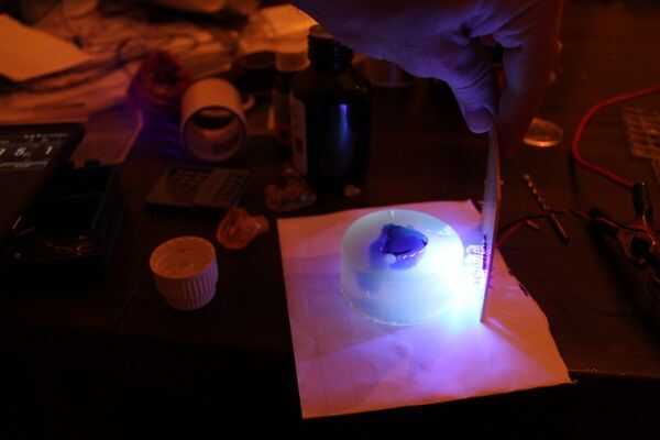 Ahora, el primer conjunto de conchas que hice con este material que he utilizado la misma técnica que con la laca Fotoplast, rellenar las cáscaras y la luz brillante durante un período de tiempo. El resultado era que las paredes eran muy, muy gruesa, y la punta era sólido (que es un problema). El segundo set, la punta era hueca, pero tuve manchas tan fina en otros lugares que tenían agujeros. Así que lo que terminé haciendo fue de un híbrido de la técnica de epoxy. Suficiente del material S/IO puse en los moldes de capa de manera uniforme y luego golpearlos con la luz UV. Una vez más, donde había puntos finas (que son mucho más fáciles de ver con el material coloreado, por cierto) sólo agrega unas cuantas gotas más y encendió inmediatamente antes pueda ejecutar o dispersar. Esto terminó funcionando perfectamente.
